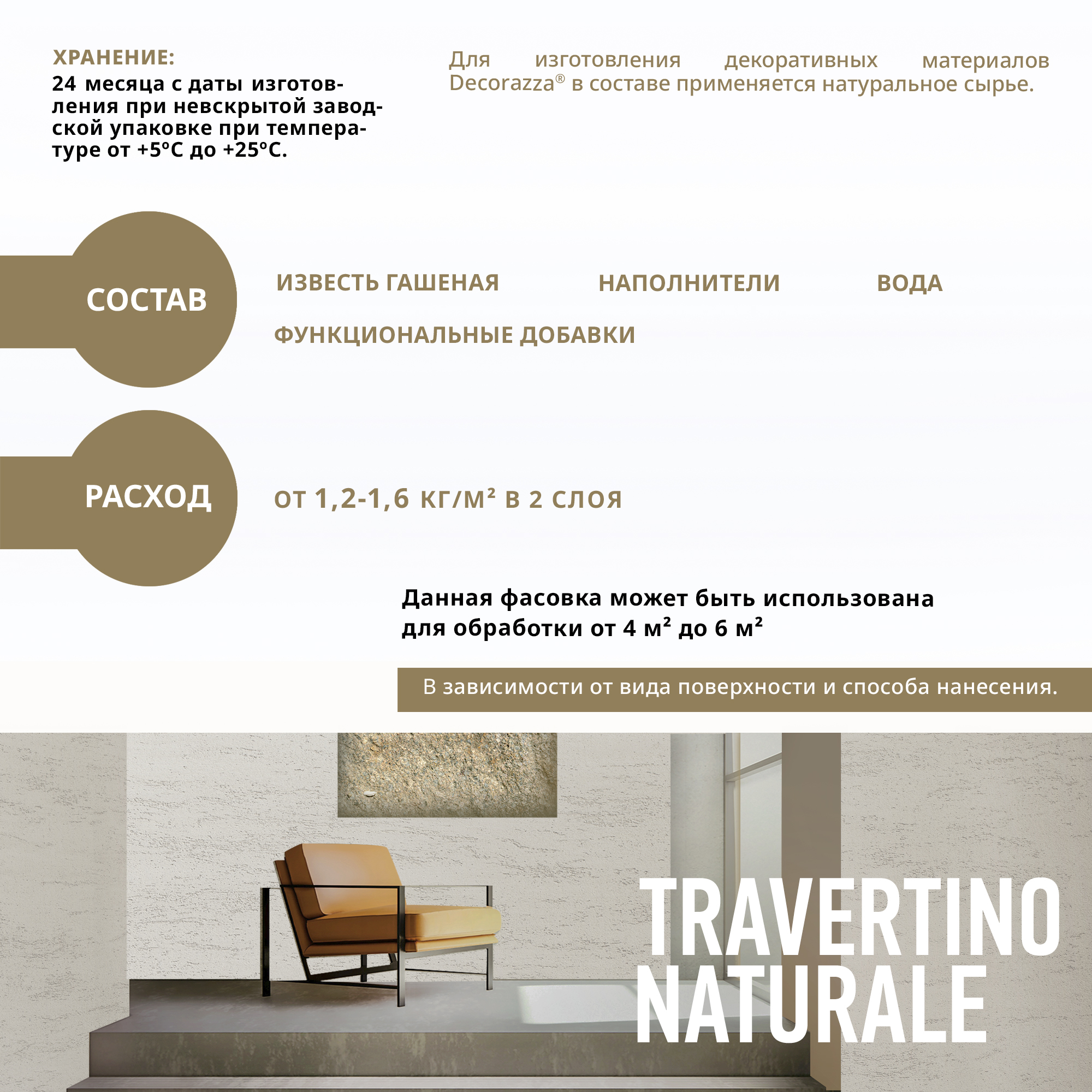 Декоративное покрытие Travertino naturale - Штукатурка для создания декоративного покрытия без швов и соединений на стенах, потолках, колоннах, фризах и других архитектурных деталях внутри помещений от бренда Decorazza с доставкой по России!