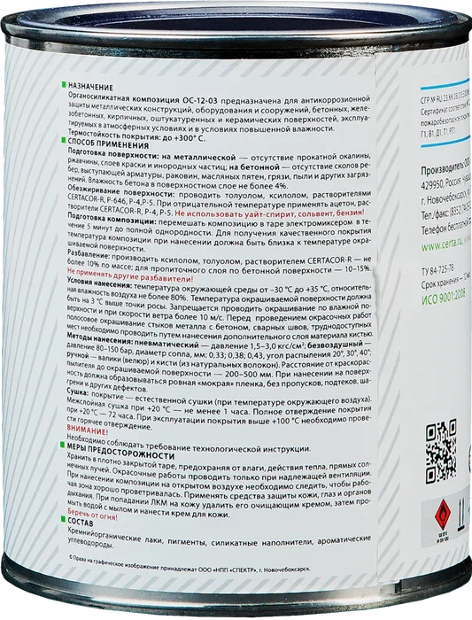 Органосиликатная композиция ОС-12-03 CERTA — грунт-эмаль, которая защищает металл, бетон, железобетон, арматуру, кирпич, цемент, штукатурку.
