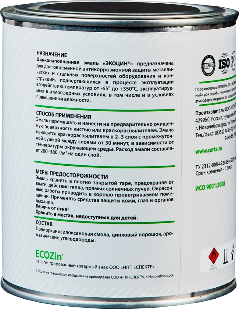 Эмаль цинконаполненная Экоцин - Быстросохнущий цинконаполненный грунт для долговременной антикоррозийной защиты металлических изделий от бренда Церта с доставкой по России!