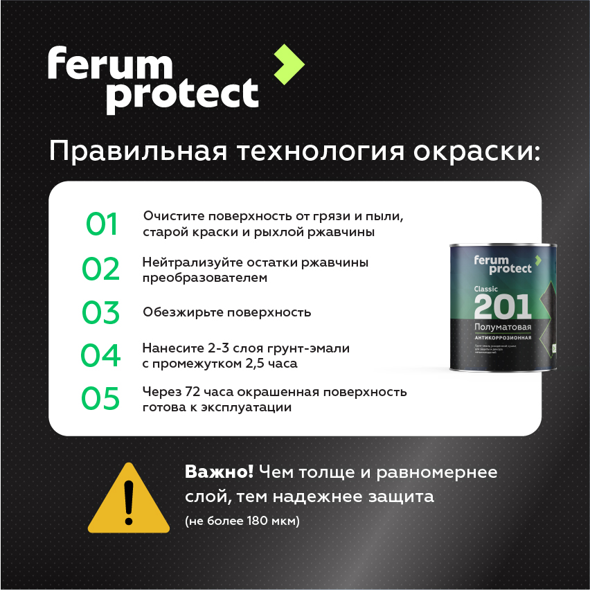 Назначение: грунт-эмаль «3в1» FERUMPROTECT-201@classic предназначена для антикоррозионной защиты металлоконструкций и других металлических поверхностей из черной стали, эксплуатируемых внутри и снаружи зданий. Применяется как самостоятельное покрытие. Может использоваться в качестве антикоррозионной грунтовки и перекрываться различными эмалями и составами, например алкидными, алкидно-модифицированными, уретановыми, акриловыми и прочими эмалями, в т.ч. водо-разбавляемыми красками и составами (например, огнезащитными составами).