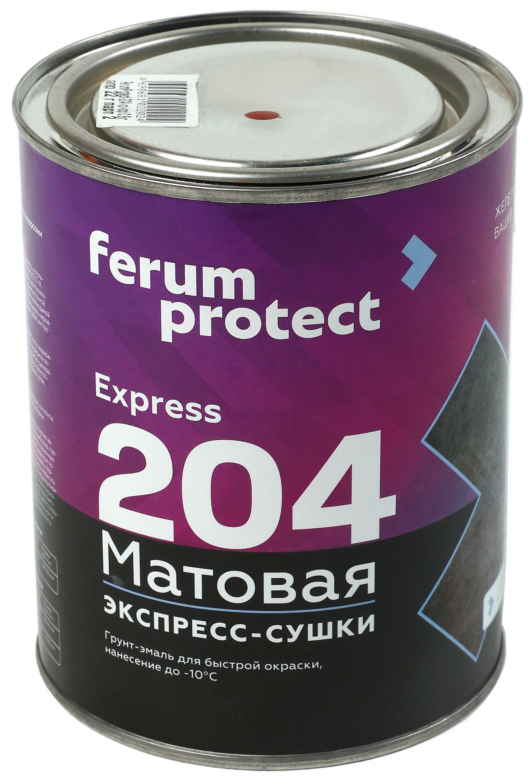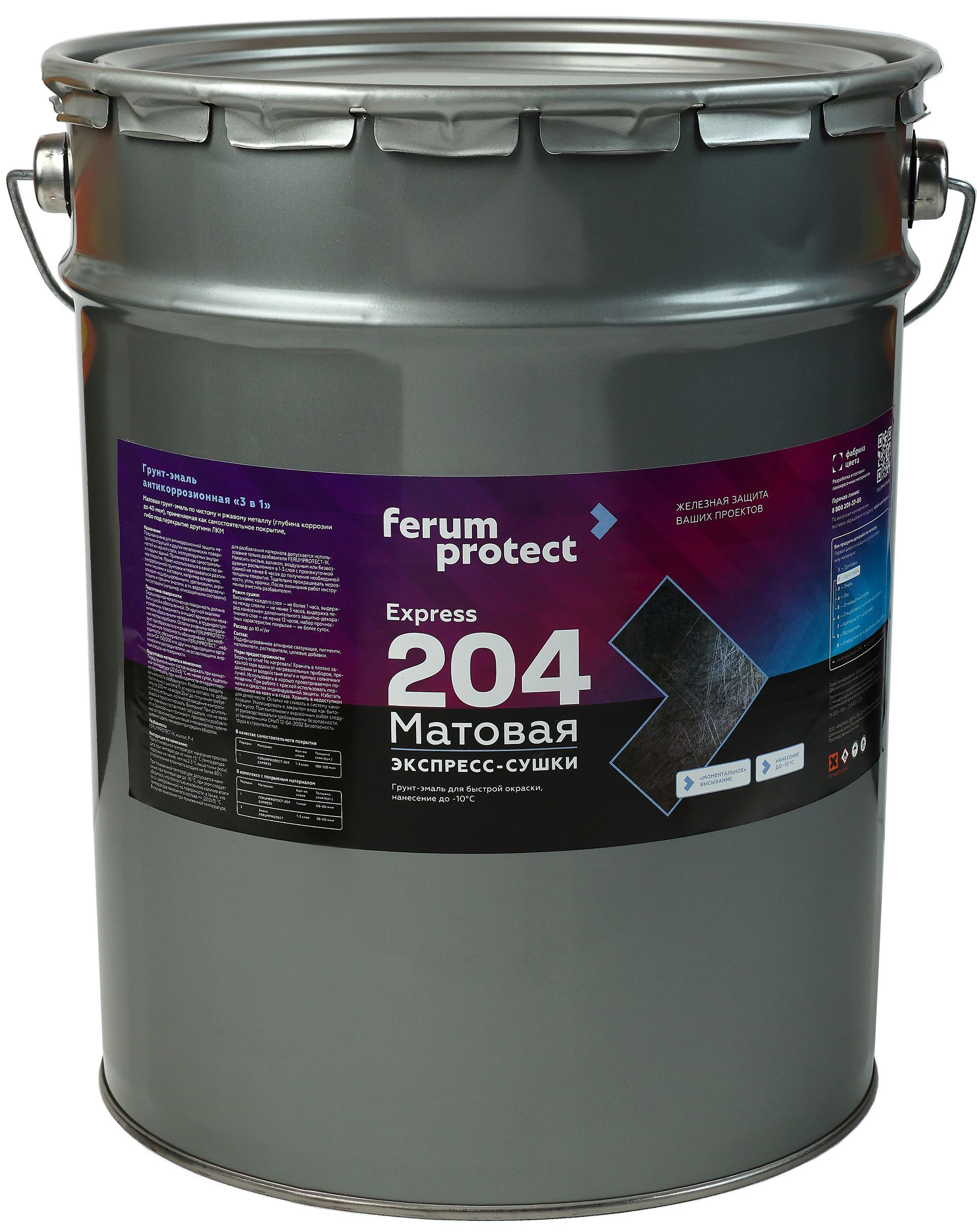 - Назначение: грунт-эмаль «3в1» FERUMPROTECT-204@express предназначена для антикоррозионной защиты металлоконструкций и других металлических поверхностей из черной стали, чугуна и других сплавов, эксплуатируемых внутри и снаружи зданий, в т.ч. в условиях агрессивной среды. Применяется как самостоятельное покрытие. Может использоваться в качестве антикоррозионной грунтовки и перекрываться различными эмалями и составами, например алкидными, алкидно-модифицированными, уретановыми, акриловыми и прочими эмалями, в т.ч. водо-разбавляемыми красками и составами (например, огнезащитными составами).