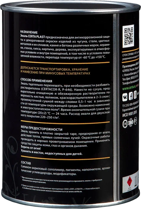 Формула CERTA на кремнийорганической основе защищает от коррозии, придает отличное сцепление с окрашиваемой поверхностью, возможность всесезонного нанесения в диапазоне −5...+35 °С. Высыхает на «отлип» за 30 минут при +20 °С.