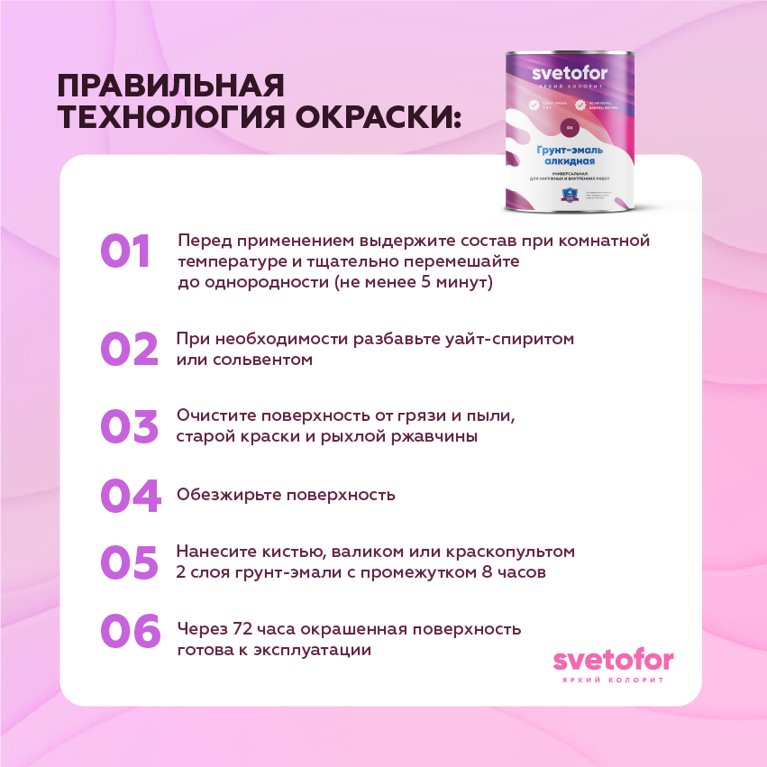 Современные технологии позволяют решать вопросы окраски различных поверхностей (деревянных, бетонных и металлических) быстро и эффективно. Грунт-эмаль Светофор® - прекрасный вариант для вашего ремонта. Эта краска 3 в 1 универсальна: она не только не требует грунтовки, но и эффективно закрасит ржавчину!