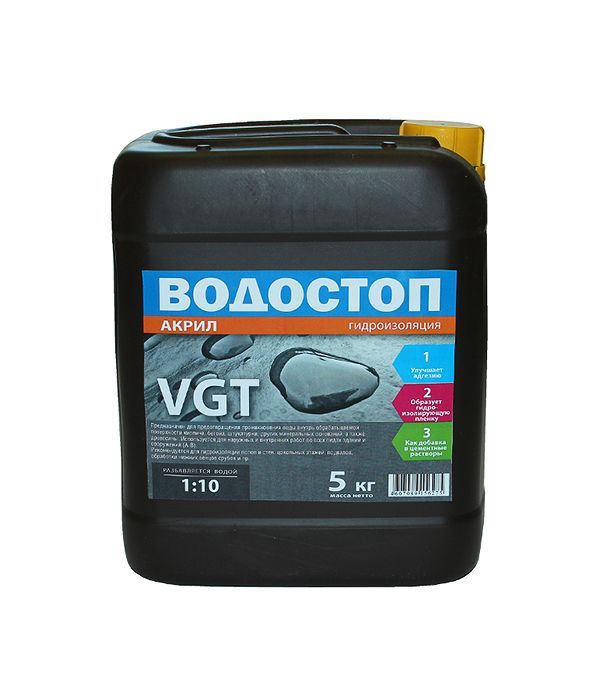 Грунт-концентрат Водостоп-акрил ВГТ - Грунт-концентрат "Водостоп-акрил ВГТ" — это инновационное средство для защиты ваших поверхностей от влаги и воды. Этот акриловый грунт отличается высокой концентрированностью, обеспечивая глубокое проникновение в структуру минеральных материалов и дерева. Благодаря своим гидроизоляционным свойствам, он создает надежную защиту от влаги, обеспечивая долговечность и устойчивость конструкции. "Водостоп-акрил ВГТ" обладает исключительной водостойкостью, что делает его идеальным выбором для использования в условиях повышенной влажности или при необходимости предотвращения проникновения влаги. Отличается также отсутствием запаха, что позволяет применять его как внутри помещений, так и снаружи, не создавая неприятных ощущений. Этот грунт идеально подходит для широкого спектра применения — от ремонта и строительства до декоративной отделки. Его способность проникать глубоко в поры материала обеспечивает превосходное сцепление с поверхностями, делая последующие работы по окрашиванию или нанесению других покрытий более эффективными и долговечными. от бренда VGT-ecology material с доставкой по России!