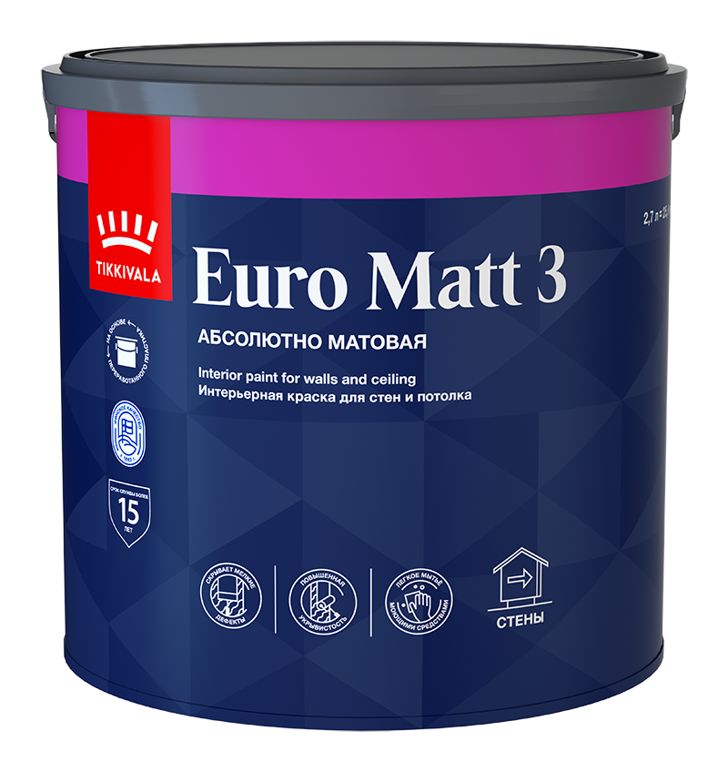 Интерьерная краска EURO MATT 3 (гл/мат) - Глубокоматовая водоразбавляемая краска для стен и потолка. Предназначена для окраски стен и потолков в сухих помещениях. Может использоваться в детских учреждениях и помещениях административной группы лечебно-профилактических учреждений от бренда Tikkurila с доставкой по России!