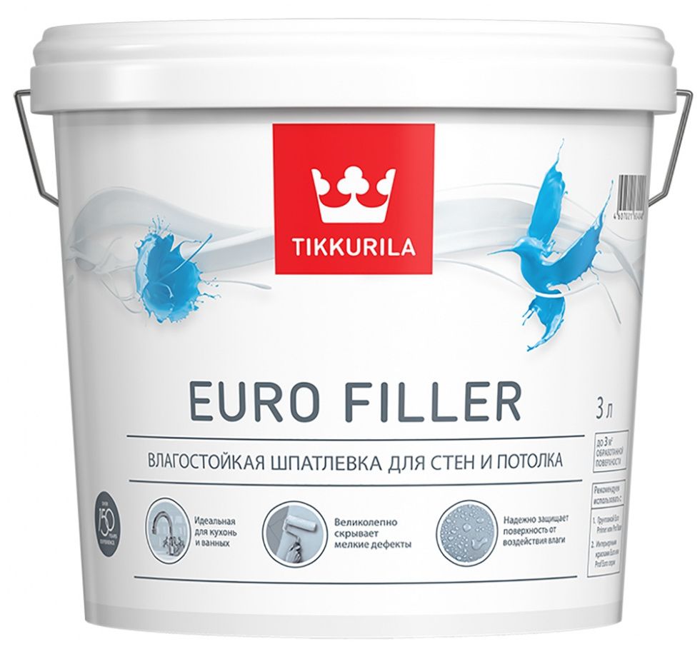 Шпатлевка влагостойкая EURO FILLER (мат)  -  Влагостойкая шпатлевка. Предназначена для выравнивания стен и потолков внутри сухих и влажных помещений по гипсокартонным плитам, оштукатуренным и бетонным поверхностям под окраску водно-дисперсионными красками или оклеивание обоями. от бренда Tikkurila с доставкой по России!